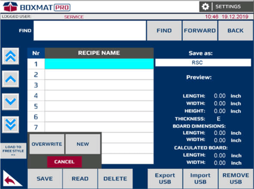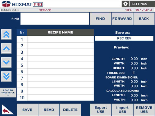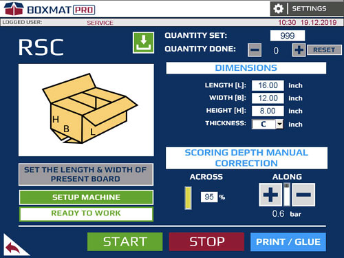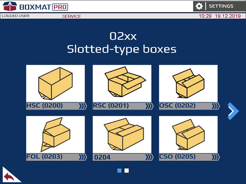 Boxmat PRO is the most modern and most versatile machine on the market and revolutionizes the production of corrugated packaging. Thanks to the automatic and tool-free change of settings on the HMI touch panel which can be changed within a few seconds, any product size may be programmed in standard, FEFCO types. PRO is ideal for the production of short series as well as for large, mass production. Slot-cutting, the removal of excess material, scoring, the removal of tongues of adhesive, as well as cutting the format to size, is carried out in one cycle without the need for additional attachment.