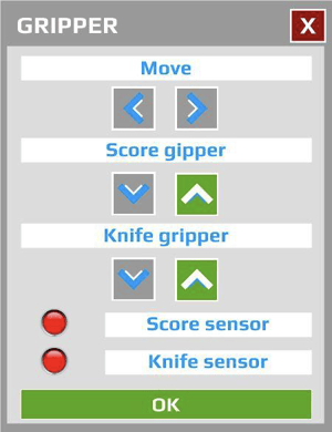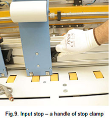 The working medium which is introduced to the system with the help of pressure reducing valve is subject to the initial filtration and then the reduction procedure due to which it is reduced to the required level. Then with the help of distribution valve controlled by the electro-pneumatic system the medium is delivered to the adequate servo-motor and as a result the said servo-motor is put in motion. Finally, the servo-motor motion will cause the relocation of razor blade due to which the glue flap will be cut off.